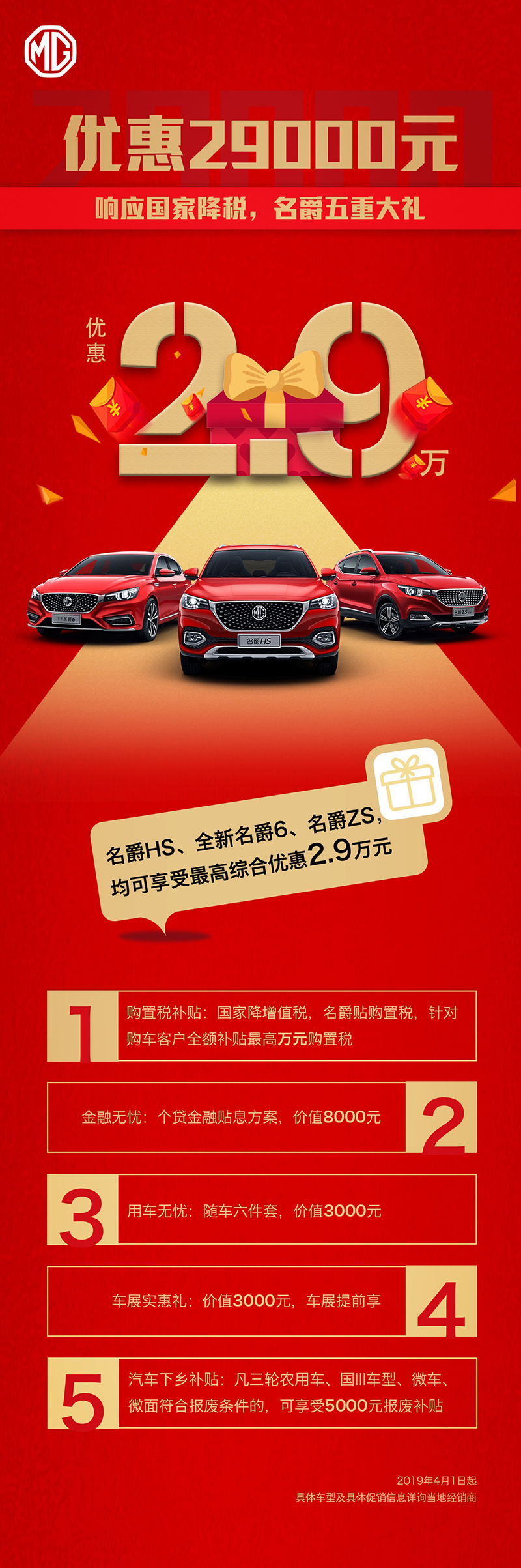 此次推出的最高2.9万元综合优惠,包括全额补贴最高万元购置税、高达8000元的个人贷款金融贴息、价值3000元的随车六件套,更有价值3000元的车展实惠礼,以及符合报废条件的三轮农用车、国III车型、微车、微面等可享5000元“汽车下乡”补贴等一大波优惠。准备买车的小伙伴们,MG名爵喊你来接福利了。