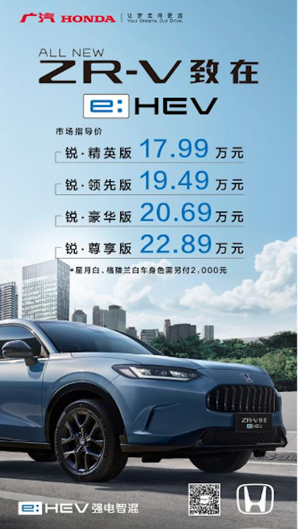 2月20日,在一场以“异彩领秀 魅力进阶”为主题的上市发布会上,广汽本田首款搭载第四代i-MMD混动系统的电驱混动SUV——ZR-V致在e:HEV正式上市发售。它是一款从智能装备到性能驾趣,全维度提供越级价值的电驱混动SUV,为年轻群体开启了属于新时代的异彩生活。共有4个版本可选择,售价17.99-22.89万元。一同上市的还有ZR-V致在240TURBO科技版,售价16.49万元。