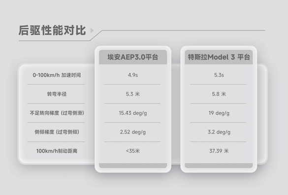 数据是最直观的,从图片上与特斯拉Model 3平台的对比可以看出,同样是3米级轴距和后驱布局的情况下,已经升级到第三代的埃安AEP 3.0平台在转弯半径、过弯侧滑侧倾、加速、刹车性能等方面均具有超越性优势,让用户尽享赛道级的超感驾驭。