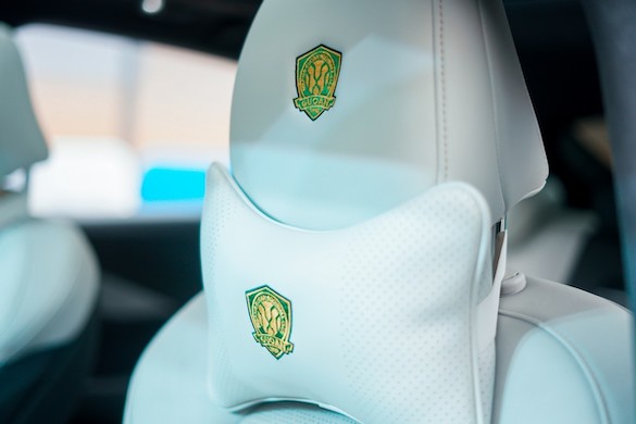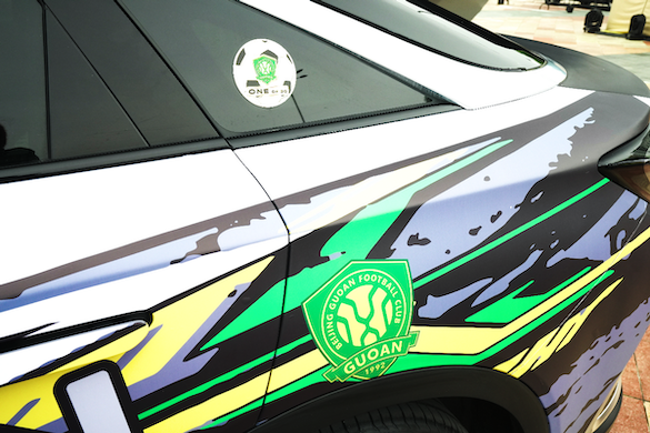 全车外观延展国安主视觉,车身提取国安颜色元素,车身带有国安中英文字母及国安队徽,线条与车身契合,整车设计前卫。车内部定制前排头枕+后排靠垫采用刺绣国安LOGO,彰显定制身份。全车四季定制座椅套并定制国安LOGO,定制刺绣国安LOGO脚垫与后备箱垫,前门定制国安迎宾白色LOGO迎宾灯。