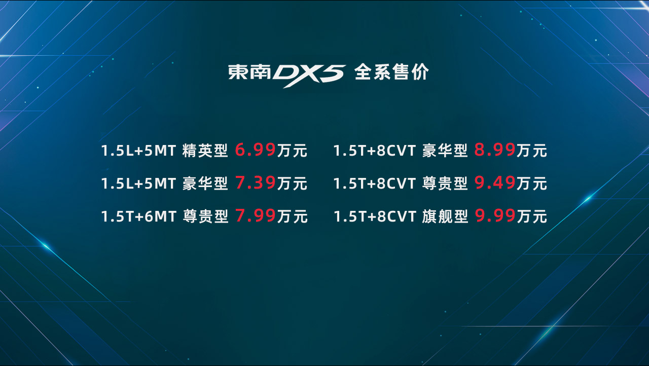 9月26日,东南DX5全国正式上市,售价6.99万元-9.99万元,全系满足国六B排放标准。作为东南汽车DX家族的新晋成员,东南DX5完美承袭了家族优秀基因,从“大气颜值”、“精致品质”、“舒适驾控”三大核心维度出发,打造看得见、摸得着、感受得到的“动心IP”,用精致实力“动心中国”献礼新中国成立70周年。